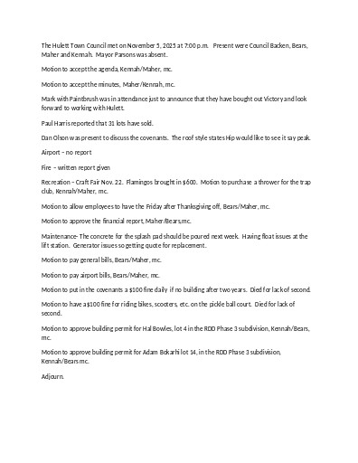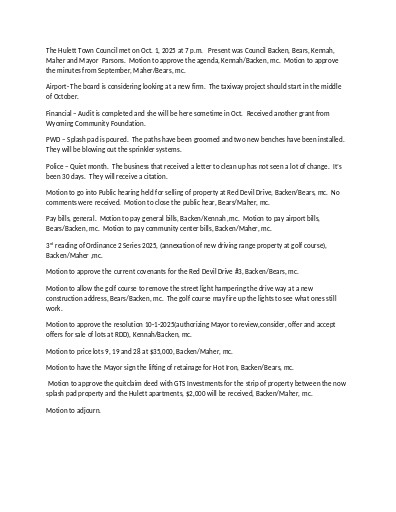 Documents Home » Town Council Minutes » 2025 Minutes Folder 2025 Minutes Home » Town Council Minutes » 2025 Minutes » The Hulett Town Council Minutes – August 7, 2025 Document The Hulett Town Council Minutes – August 7, 2025 Published on 07 August 2025 Modified on 08 September 2025 By derekolson 382 downloads Download (docx, 14 KB) The Hulett Town Council met on August.docx Home » Town Council Minutes » 2025 Minutes » The Hulett Town Council Minutes – December 4, 2025 Document The Hulett Town Council Minutes – December 4, 2025 Published on 04 December 2025 Modified on 09 January 2026 By derekolson 306 downloads Download (docx, 14 KB) council dec. 4, 2025.docx Home » Town Council Minutes » 2025 Minutes » The Hulett Town Council Minutes – July 2, 2025 Document The Hulett Town Council Minutes – July 2, 2025 Published on 02 July 2025 Modified on 12 August 2025 By derekolson 495 downloads Download (docx, 14 KB) The Hulett Town Council met on July 2.docx Home » Town Council Minutes » 2025 Minutes » The Hulett Town Council Minutes – June 4, 2025 Document The Hulett Town Council Minutes – June 4, 2025 Published on 06 June 2025 Modified on 03 July 2025 By derekolson 608 downloads Download (docx, 14 KB) The Hulett Town Council met on June 4.docx Home » Town Council Minutes » 2025 Minutes » The Hulett Town Council Minutes – November 5, 2025 Document The Hulett Town Council Minutes – November 5, 2025 Published on 05 November 2025 Modified on 04 December 2025 By derekolson 240 downloads Download (docx, 13 KB) council nov. 2025 meeting.docx Home » Town Council Minutes » 2025 Minutes » The Hulett Town Council Minutes – October 1, 2025 Document The Hulett Town Council Minutes – October 1, 2025 Published on 01 October 2025 Modified on 10 November 2025 By derekolson 290 downloads Download (docx, 13 KB) The Hulett Town Council met on Oct. 2025.docx Home » Town Council Minutes » 2025 Minutes » The Hulett Town Council Minutes – September 3, 2025 Document The Hulett Town Council Minutes – September 3, 2025 Published on 03 September 2025 Modified on 02 October 2025 By derekolson 415 downloads Download (docx, 14 KB) The Hulett Town Council met on September 3.docx Home » Town Council Minutes » 2025 Minutes » The Hulett Town Council Minutes – April 2, 2025 Document The Hulett Town Council Minutes – April 2, 2025 Published on 05 June 2025 Modified on 05 June 2025 By derekolson 582 downloads Download (docx, 13 KB) The Hulett Town Council met on April 2. 2025.docx Home » Town Council Minutes » 2025 Minutes » The Hulett Town Council Minutes – February 5, 2025 Document The Hulett Town Council Minutes – February 5, 2025 Published on 05 June 2025 Modified on 05 June 2025 By derekolson 479 downloads Download (docx, 13 KB) feb 2025 council.docx Home » Town Council Minutes » 2025 Minutes » The Hulett Town Council Minutes – January 8, 2025 Document The Hulett Town Council Minutes – January 8, 2025 Published on 05 June 2025 Modified on 05 June 2025 By derekolson 542 downloads Download (docx, 13 KB) The Town of Hulett met on January 8.docx Home » Town Council Minutes » 2025 Minutes » The Hulett Town Council Minutes – March 4, 2025 Document The Hulett Town Council Minutes – March 4, 2025 Published on 05 June 2025 Modified on 05 June 2025 By derekolson 530 downloads Download (docx, 13 KB) The Hulett Town Council met on March 4.docx