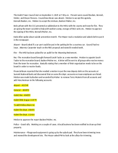 Documents Home » Town Council Minutes » 2025 Minutes Folder 2025 Minutes Home » Town Council Minutes » 2025 Minutes » The Hulett Town Council Minutes – August 7, 2025 Document The Hulett Town Council Minutes – August 7, 2025 Published on 07 August 2025 Modified on 08 September 2025 By derekolson 102 downloads Download (docx, 14 KB) The Hulett Town Council met on August.docx Home » Town Council Minutes » 2025 Minutes » The Hulett Town Council Minutes – July 2, 2025 Document The Hulett Town Council Minutes – July 2, 2025 Published on 02 July 2025 Modified on 12 August 2025 By derekolson 159 downloads Download (docx, 14 KB) The Hulett Town Council met on July 2.docx Home » Town Council Minutes » 2025 Minutes » The Hulett Town Council Minutes – June 4, 2025 Document The Hulett Town Council Minutes – June 4, 2025 Published on 06 June 2025 Modified on 03 July 2025 By derekolson 248 downloads Download (docx, 14 KB) The Hulett Town Council met on June 4.docx Home » Town Council Minutes » 2025 Minutes » The Hulett Town Council Minutes – September 3, 2025 Document The Hulett Town Council Minutes – September 3, 2025 Published on 03 September 2025 Modified on 02 October 2025 By derekolson 53 downloads Download (docx, 14 KB) The Hulett Town Council met on September 3.docx Home » Town Council Minutes » 2025 Minutes » The Hulett Town Council Minutes – April 2, 2025 Document The Hulett Town Council Minutes – April 2, 2025 Published on 05 June 2025 Modified on 05 June 2025 By derekolson 261 downloads Download (docx, 13 KB) The Hulett Town Council met on April 2. 2025.docx Home » Town Council Minutes » 2025 Minutes » The Hulett Town Council Minutes – February 5, 2025 Document The Hulett Town Council Minutes – February 5, 2025 Published on 05 June 2025 Modified on 05 June 2025 By derekolson 219 downloads Download (docx, 13 KB) feb 2025 council.docx Home » Town Council Minutes » 2025 Minutes » The Hulett Town Council Minutes – January 8, 2025 Document The Hulett Town Council Minutes – January 8, 2025 Published on 05 June 2025 Modified on 05 June 2025 By derekolson 239 downloads Download (docx, 13 KB) The Town of Hulett met on January 8.docx Home » Town Council Minutes » 2025 Minutes » The Hulett Town Council Minutes – March 4, 2025 Document The Hulett Town Council Minutes – March 4, 2025 Published on 05 June 2025 Modified on 05 June 2025 By derekolson 240 downloads Download (docx, 13 KB) The Hulett Town Council met on March 4.docx